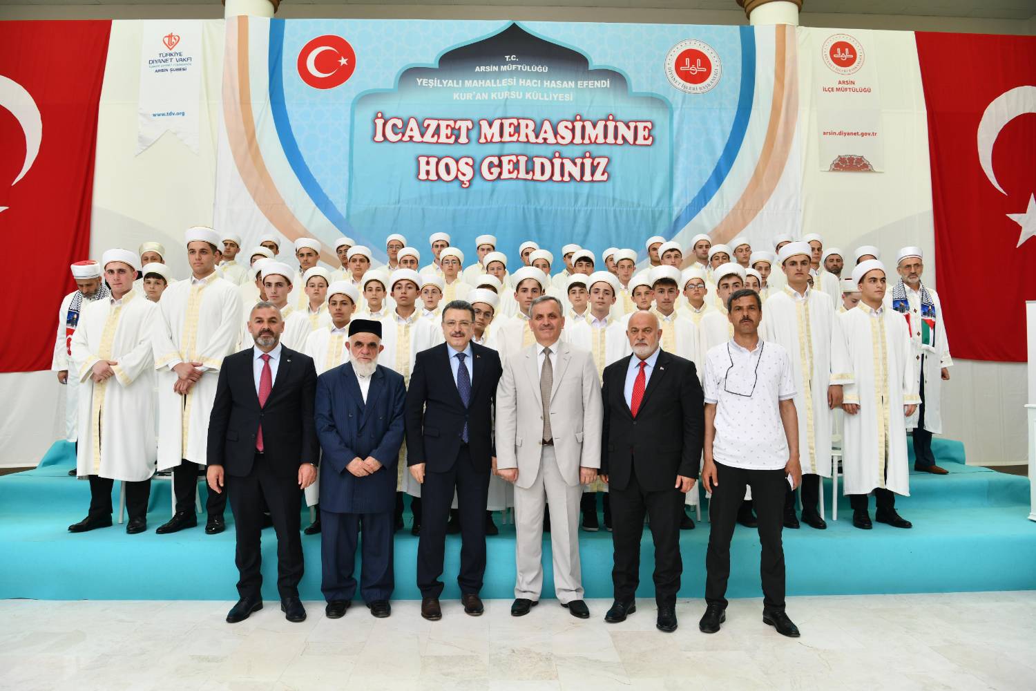 Trabzon Büyükşehir Belediye Başkanı Ahmet Metin Genç, Arsin Müftülüğü’nün düzenlediği Yeşilyalı Mahallesi Hacı Hasan Efendioğlu Kur'an Kursu’nun 42. döneminde mezun olan 87 öğrencinin İcazet Duası programına katıldı. Yeşilyalı Merkez Kur'an Kursu’nda düzenlenen törende Arsin Kaymakamı Ömer Sirkeci, Gaziantep İslam ve Bilim Teknolojileri Üniversitesi Rektörü Prof. Dr. Şehmuz Demir, Arsin Belediye Başkanı Hamza Bilgin, Trabzon İl Müftüsü Selami Aydın, din görevlileri ve çok sayıda öğrenci ile aileleri yer aldı. Güzel bir ibadetin içerisinde olduklarını belirten Başkan Genç, “Ne mutlu bize ki Cenab-ı Allah’ın, peygamber efendimiz arayıcılığıyla bize ulaştırdığı kutsal kitabımızı yeryüzüne yaymak için güzel bir ibadetin içerisindeyiz. Çok şükür ki şu anda ülkemizin her karış toprağında bu ibadetler rahatlıkla yapılabiliyor. Trabzon'umuzda 1461 hafızımızın icazet merasimini yaptık. Bizi bugünlere getiren Cenab-ı Allah'a hamdolsun” dedi.